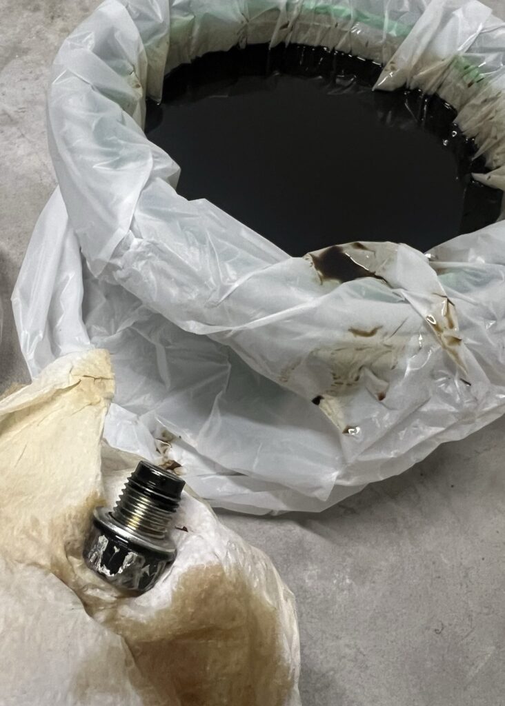 剩下的就简单了,新机滤添油润滑垫圈,拧回去,15Nm扭矩拧紧。放油螺丝换个新铝制垫片,35Nm拧紧。加机油,加满后启动发动机,正常启动也没有漏油。看下机油尺,机油好像有些多,超过Max标度,这个很奇怪,记得手册写的是3.8-4.2L,加4L不应该多这么多,旧的机油倒回桶里3.5L,算上外面塑料袋上很难倒进去的总共也差不多4L。等车放平静置一夜再看。