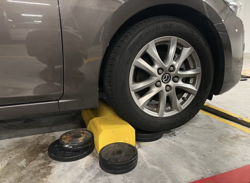 汽车前面要抬高,最初打算开到停车位定位小混凝土挡上,结果开过头前轮卡在另一边,在门房大爷和S的帮助下才开出来。最后决定把杠铃片叠起来开上去,也不容易做,开上去人勉强能挤到车下拧螺丝。